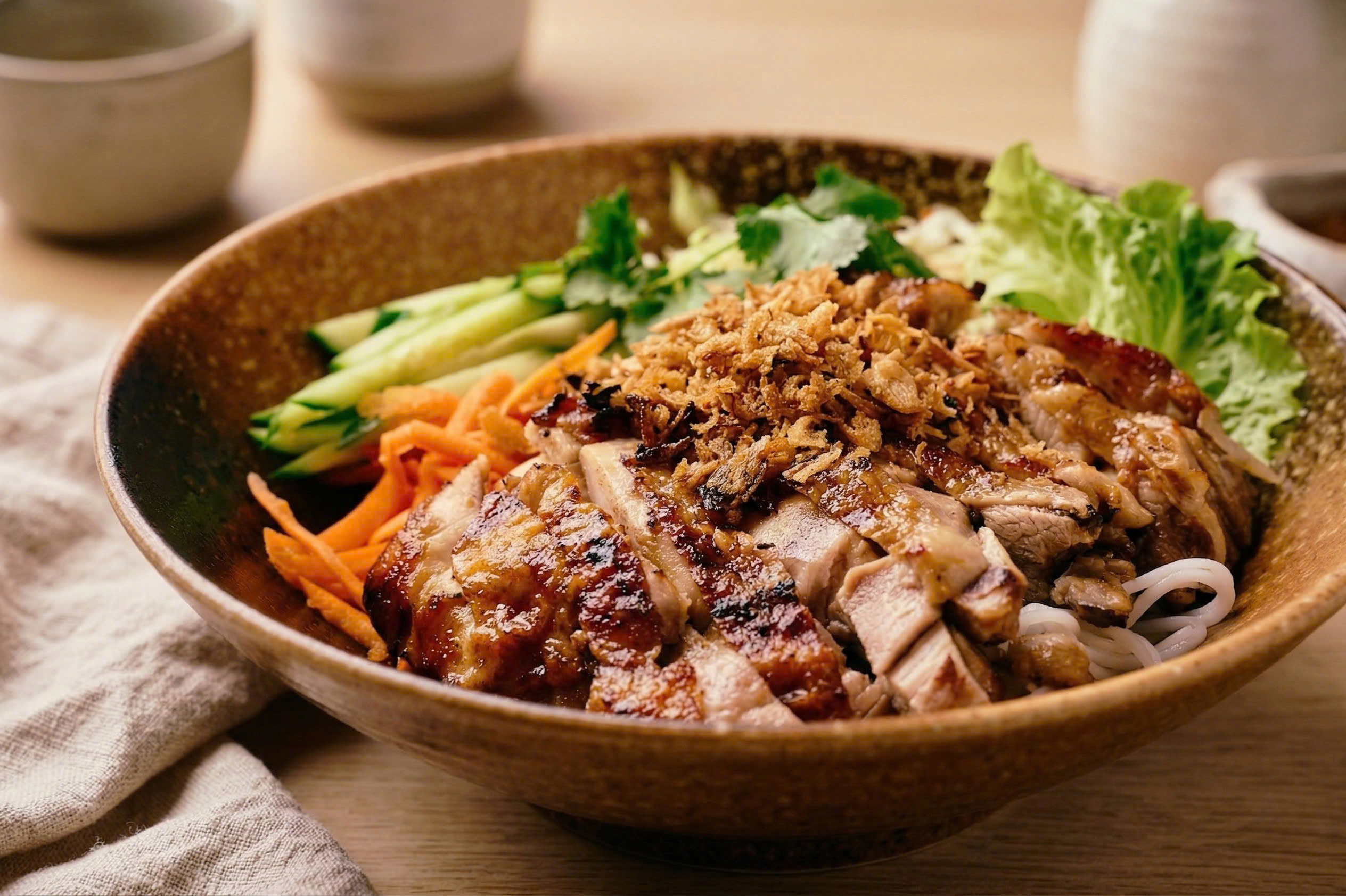 Fresh vermicelli with lemongrass beef, herbs, pickled vegetables, and house dressing.