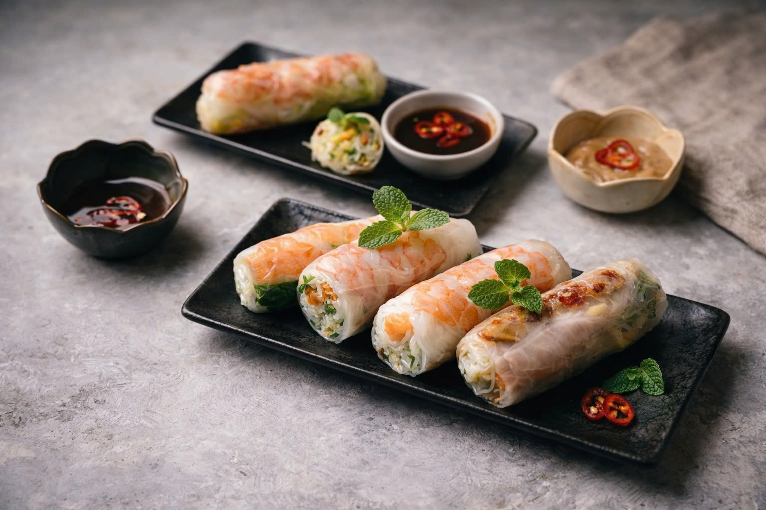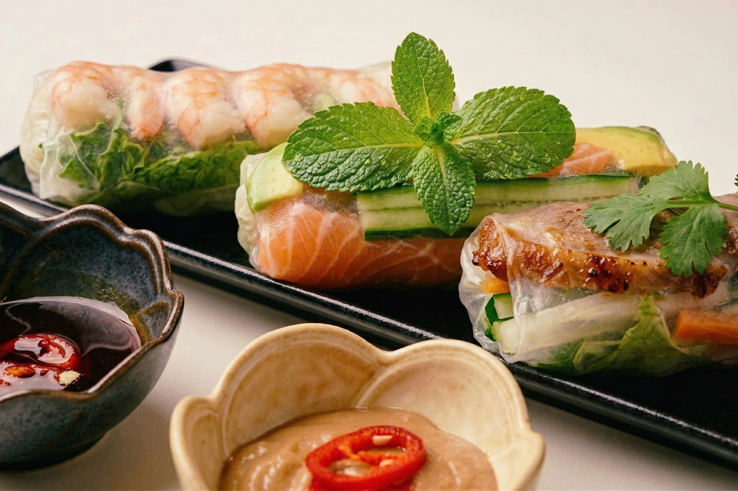 Fresh rice paper rolls with vermicelli, herbs, lettuce, carrot, and your choice of sauce.