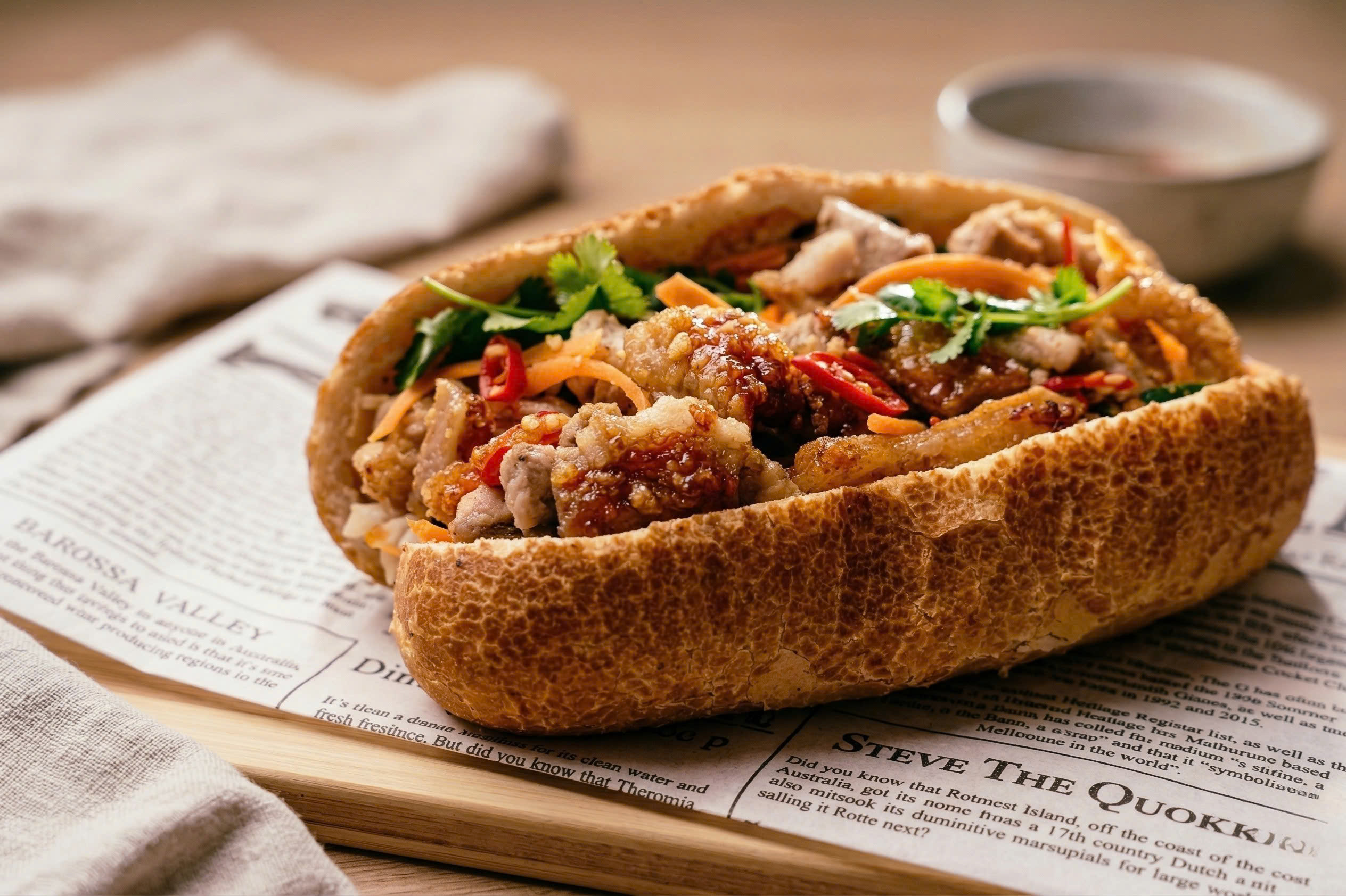 Golden, butter-brushed baguette with baked pâté, crispy pork, pickled vegetables, and signature herb-infused sauce.