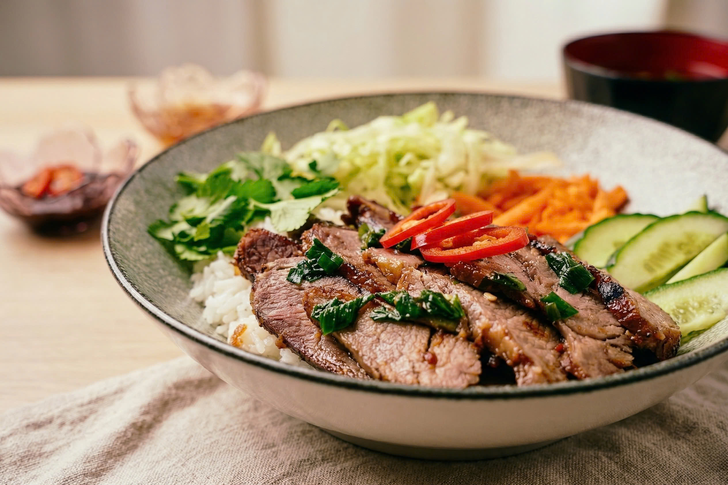 Fresh vermicelli bowl with lemongrass beef, herbs, pickled vegetables, and house dressing.