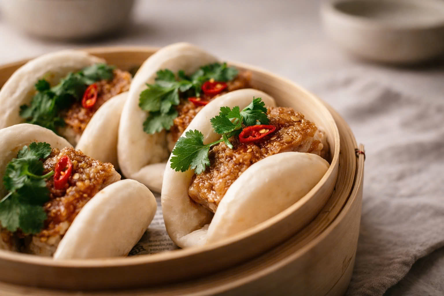 Soft, fluffy steamed bun served with fresh vegetables and signature sauce.