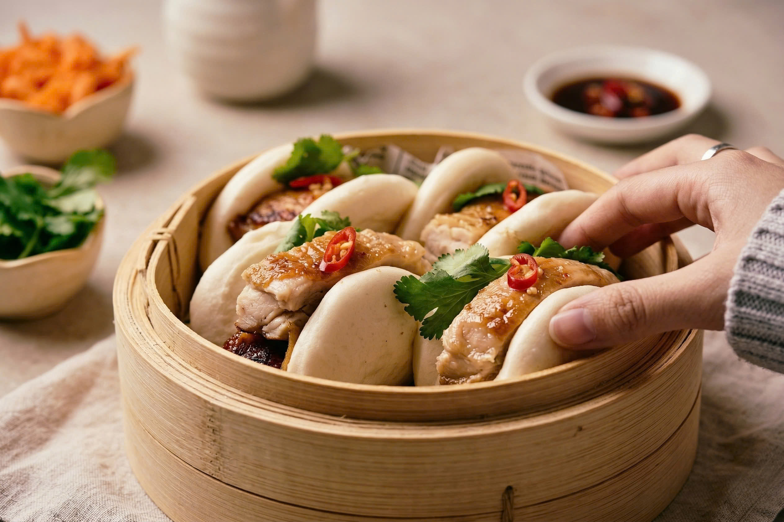 Soft, fluffy steamed bun served with crispy tempura prawn, fresh vegetables, and signature sauce.